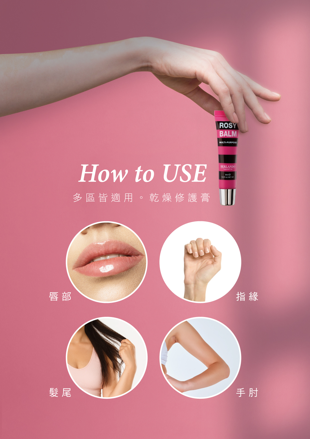 - 多區域保養品 嘴唇、指緣、手肘、腳跟、髮尾 等任何皮膚乾燥部位適用