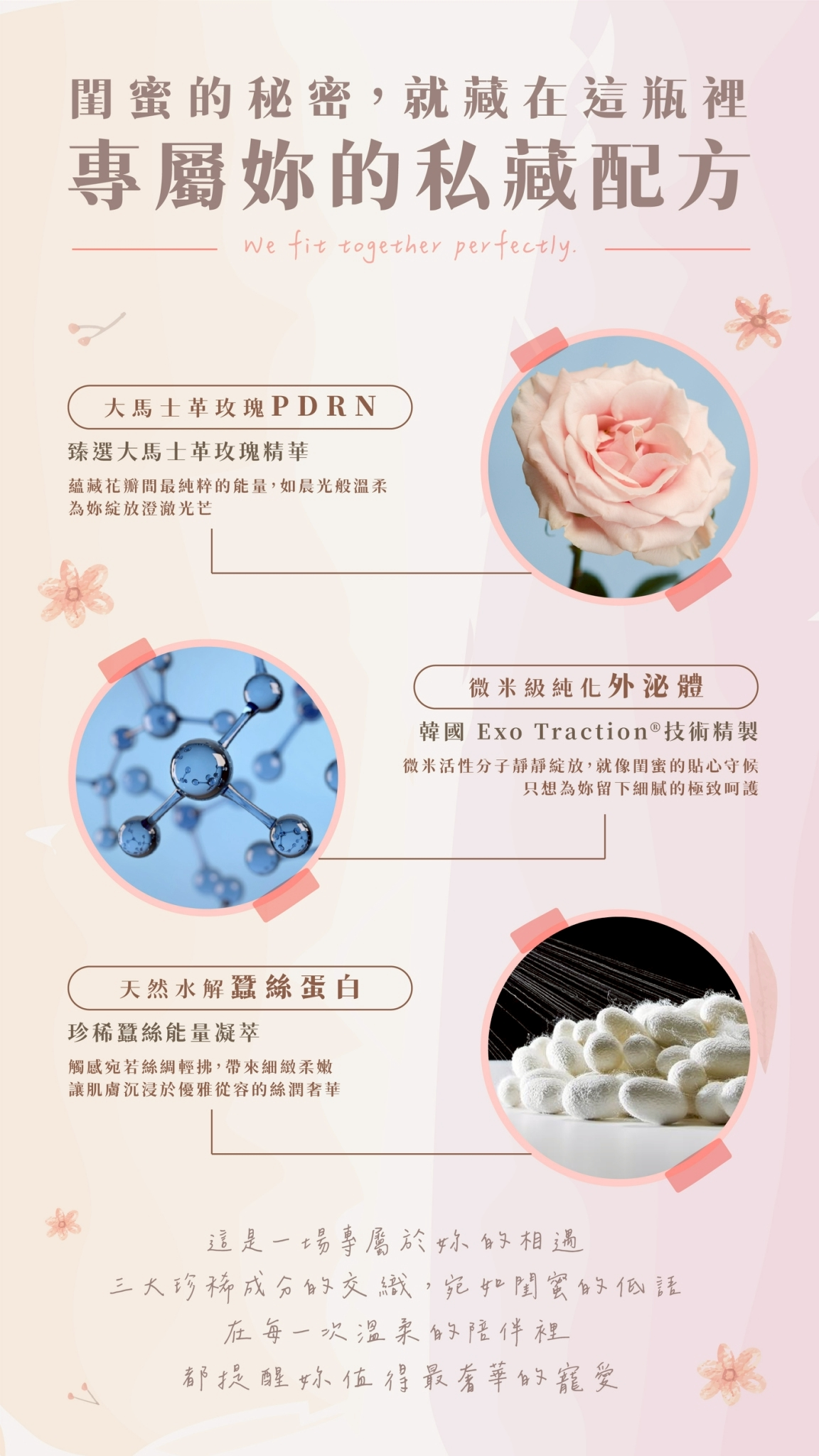 主要成分:山茶花植物囊泡、牛奶外泌體、玫瑰PDRN、清酒酵母、銀耳子實體多醣體、米糠粉、阿爾卑斯玫瑰、沙漠玫瑰幹細胞